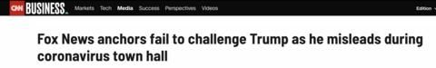 ,而特朗普在社交媒体上多次引用福克斯主持人对美国有线电视新闻网的批评,并表示美国有线电视新闻网传播“虚假新闻”福克斯电视台美容节目主持人特雷西·里根在三月中旬声称,民主党人夸大了这种流行病是“弹劾总统的又一次尝试”,自由媒体中的许多人利用新的皇冠病毒来妖魔化总统并试图摧毁他。”这一声明随后招致了美国有线电视新闻网和《华盛顿邮报》的激烈批评