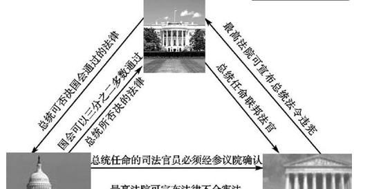 1年,国会和总统可以相互否决,国会可以否决总统提案,总统可以否决国会决议;2.国会和法院可以相互否决。国会可以弹劾最高法院法官。法院可以宣布国会的决议违反了宪法。3.总统可以任命最高法院的法官,但法官独立于司法机构,法官可以宣布总统违宪