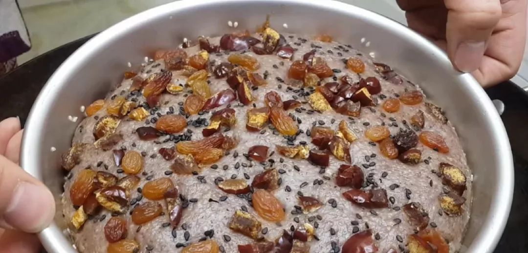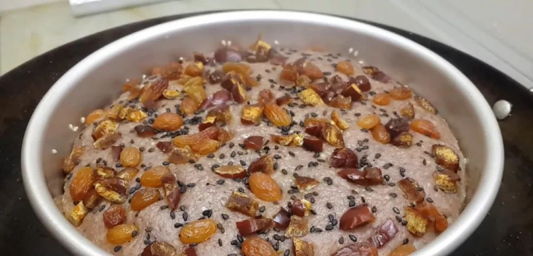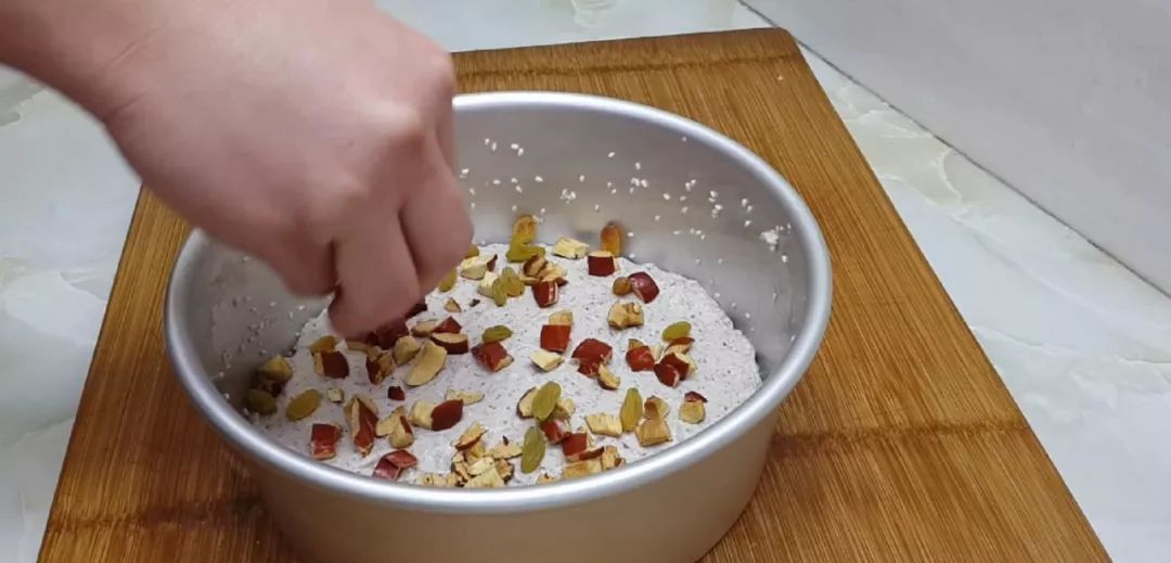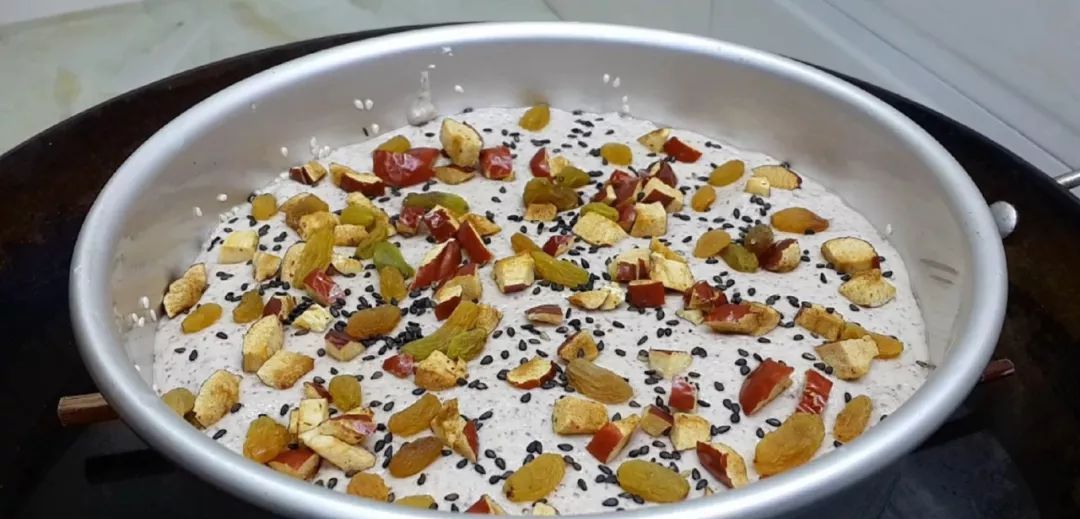 撒上一层红枣丝,撒上葡萄干,然后浇上大米和红豆酱将黑芝麻撒在