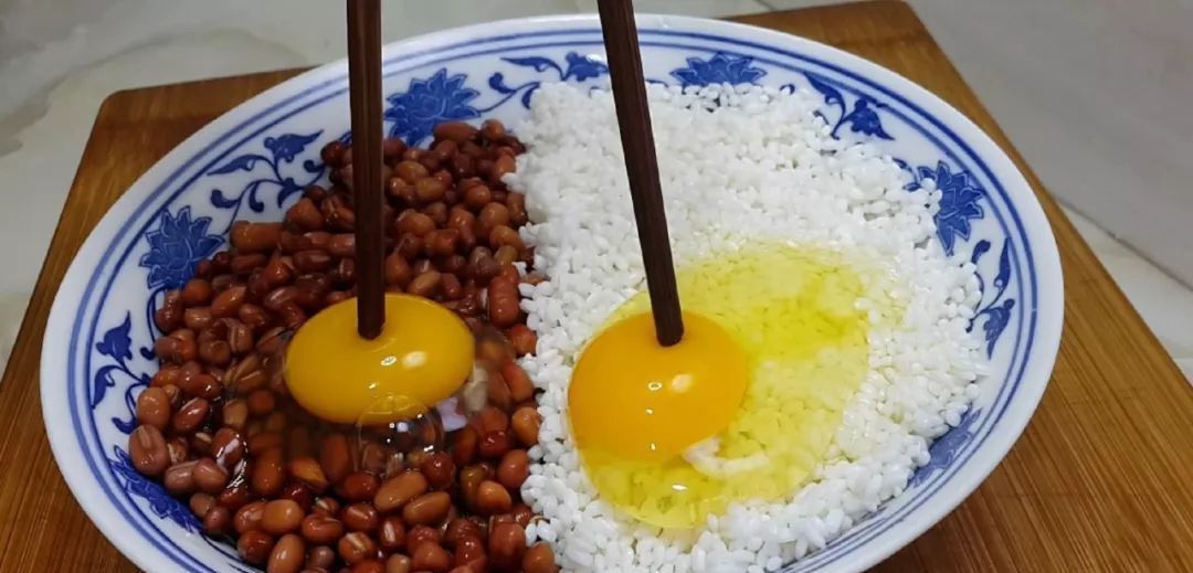 打鸡蛋,用筷子搅拌均匀,用蛋液包裹大米和红豆