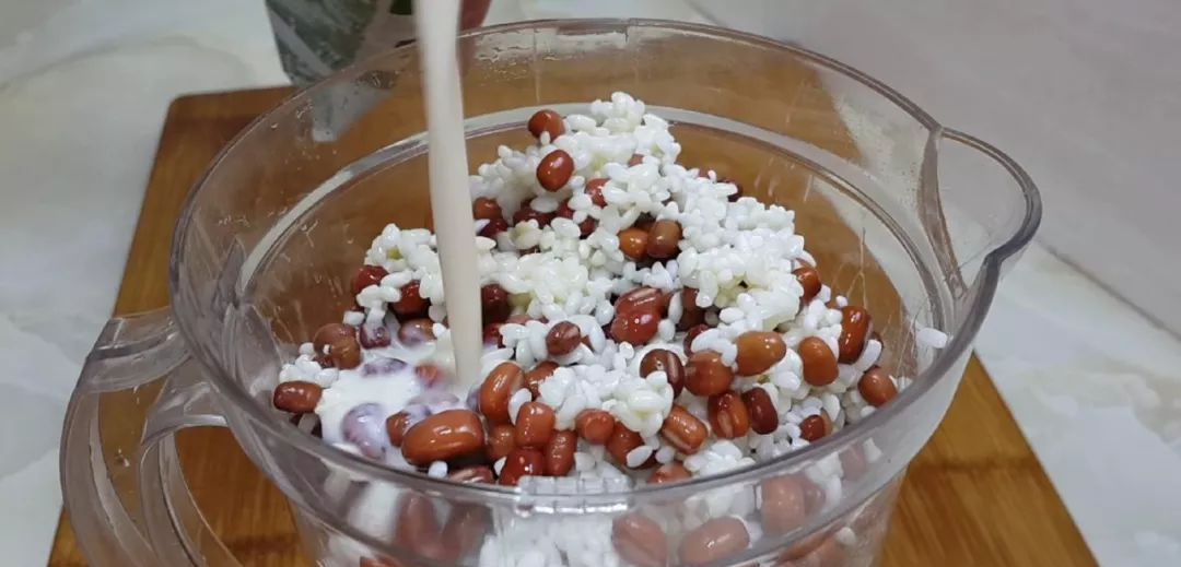红豆和大米,倒入蒸煮机中,倒入1/3纯牛奶(红豆米与牛奶的比例:3/1)