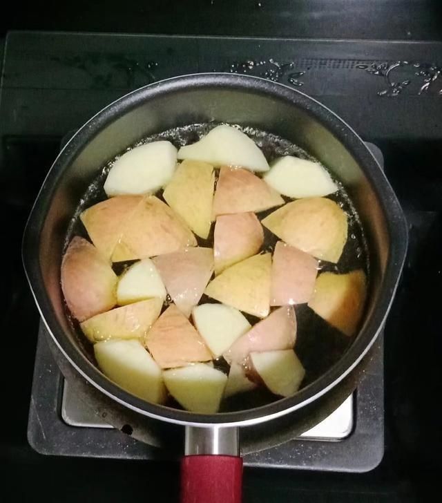 4。在锅里烧开水。打开水,把苹果煮5分钟。加入菠萝,煮至菠萝变成透明的