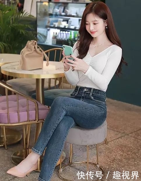 小妹穿了一条修身牛仔裤。高腰小腿部的设计对小妹腿部线条的表达有很好的装饰效果。首先,高腰款式的设计不仅改善了腰线,而且使腿部的形状纤细匀称。