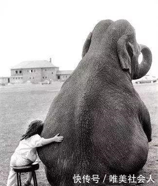 13。小女孩坐在凳子上,紧抱着大象,一大一小,看起来如此和谐美丽。