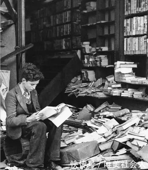 19,被炸的书店,书散落一地,一片狼藉,一个年轻人正坐在那里静静地看着书