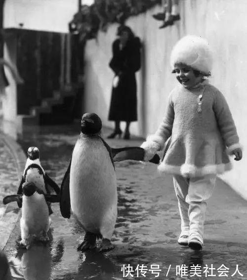 25。在动物园里,一只热情的企鹅把他的手交给一个小女孩,然后带着他的家人自豪地游行。