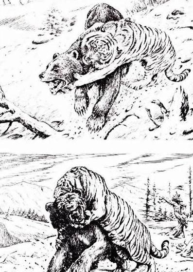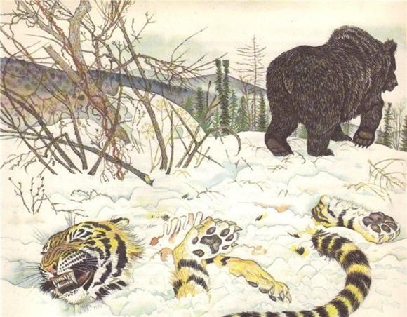 最大的棕熊被老虎杀死是在1965年由拉莫夫报道的。他在文章中指出,1959年底,老虎杀死了一只大棕熊,并在离开前吃了10天。根据老虎的食欲,我们估计受伤的棕熊超过200公斤,这可能是一只雄熊。
