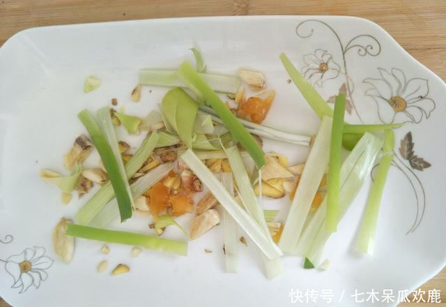 2。准备材料,清洗韭菜,并把它们切成细丝。大蒜需要事先打好,切成小颗粒,姜切成粉末,将大蒜、姜和韭菜放入鱼盘的底部