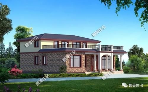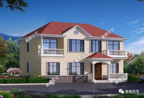 房屋类型2: 14.8×9.6米,砖混结构,适用于北方农村建造的房屋,砖量少,大面积真石漆装饰,坡屋顶为红色波纹瓦。