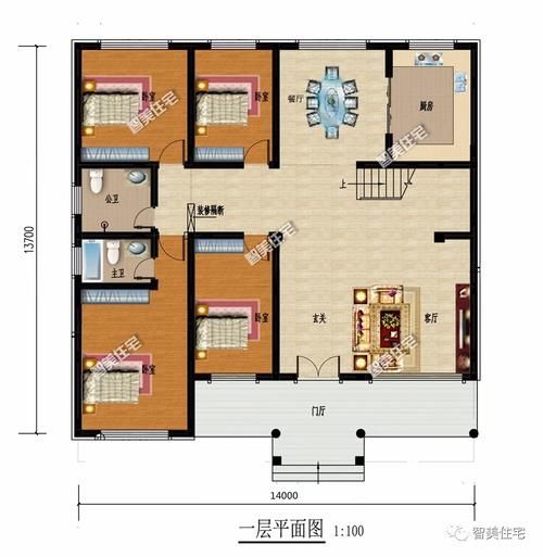 房屋类型1:14×13.7米,外墙表面装饰文化石和黄色真石漆,砖混结构,主体造价30万元,二楼一个大露台作为打谷场。