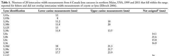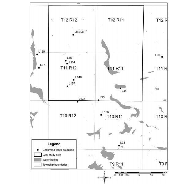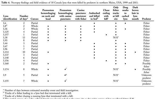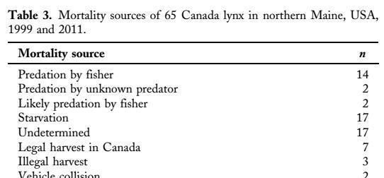 研究区域中,只有12%属于成熟针叶树,但是渔民杀死加拿大猞猁的大部分(12)发生在成熟针叶树中。这些森林的树冠高度为12.3-18.3米,树冠闭合率在25%至50%之间此外,一只猞猁在再生针叶林中被一名渔民杀死,另一只猞猁在成熟的落叶森林中被杀死。四起无法确定捕食者种类的谋杀也发生在成熟的针叶林中。这是第一项记录渔民捕杀加拿大猞猁的研究。后来,研究人员还在明尼苏达州发现了两起渔民杀死加拿大猞猁的疑似事件过去也有这样的轶事记录。