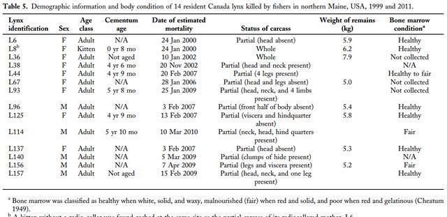 之前,学者们认为雪貂主要捕猎年轻、无家可归或健康状况不佳的加拿大猞猁。然而,几乎所有在这项研究中被杀的加拿大猞猁都是定居的个体,他们已经建立了自己的家园,只有一只8个月大的猞猁和她的母亲一起被杀。股骨的骨髓检查也证实了这些猞猁在被杀死时都是健康的个体,即使在2007-2011年雪鞋兔的密度非常低的时候。