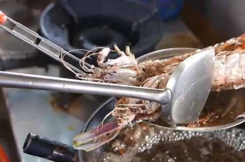 这时,日本厨师将虾稍加处理,然后开始炒锅烧油,然后等到锅里的油烧开,然后放入锅里炒菜。我在油锅里呆了10多分钟,但虾皮被烤焦了。日本厨师把它捞出来,然后在中间加入一些配料和调味料,这样我就可以把它拿出来吃了。