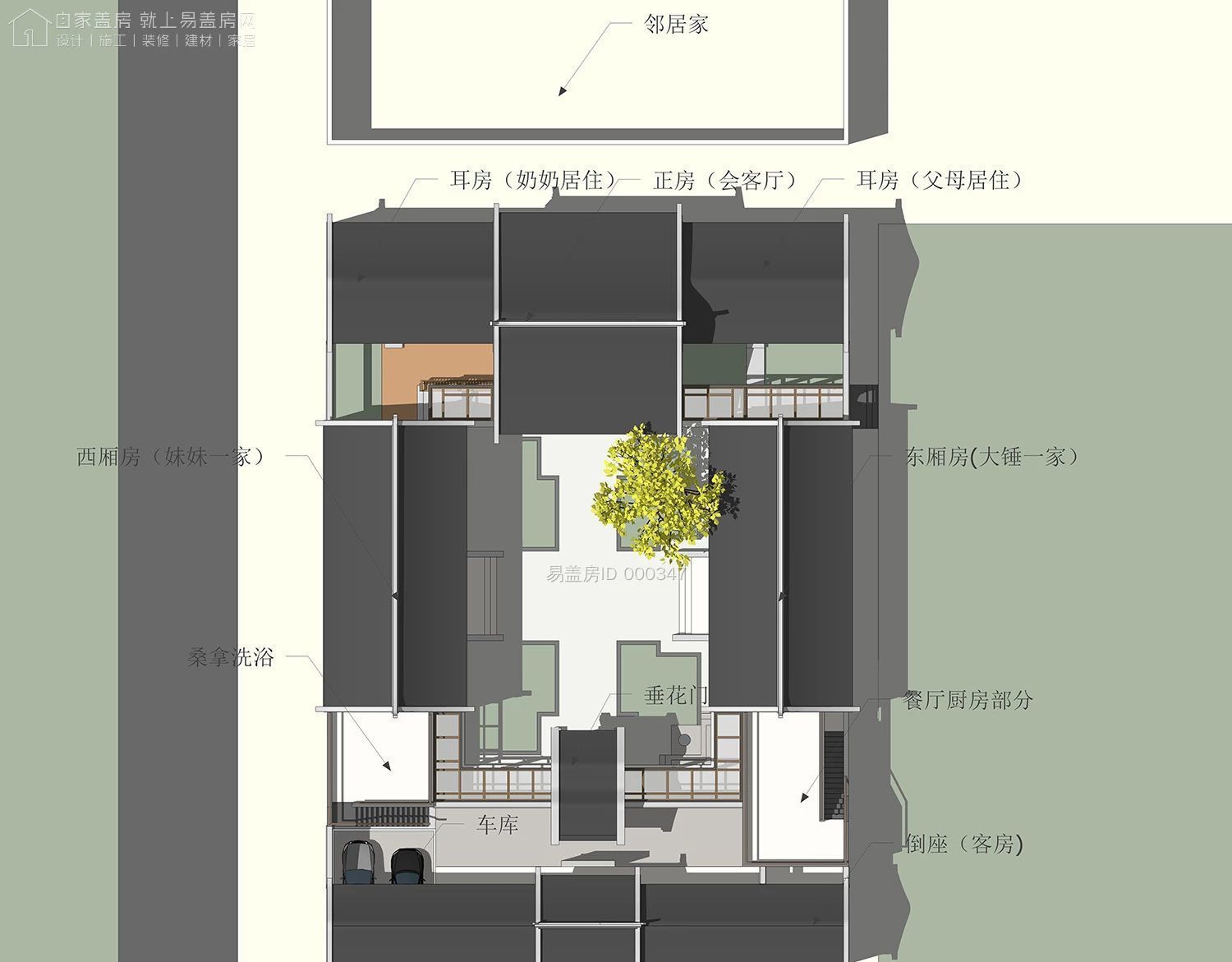 移植楼梯,以便在二楼室外开放式餐厅共享晚餐。西部洗衣房可在二楼和二楼干燥,带有露台,居民可在此干燥干净的衣服或进行户外活动。四合院的东、西、南、北四个方向的房子是相互独立的。所有的房子都在一楼,通过街角的玻璃波连接在一起。