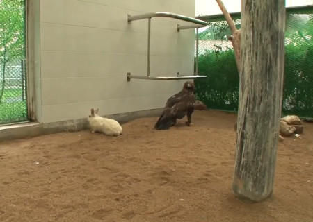 后来,兔子动了,金雕吓坏了,飞到架子上三两下,不敢动也许兔子太大了?当突然碰到这么大的生物,它不适应吗?