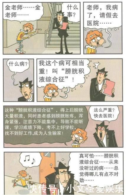 旁白:阿帅在休息时似乎很痛苦。他颤抖着请假。金老师问他怎么了。阿帅说是膀胱积液综合征...这么奇怪的名字。难怪阿帅在金老师的迷雾中说了很多花里胡哨的专业术语...