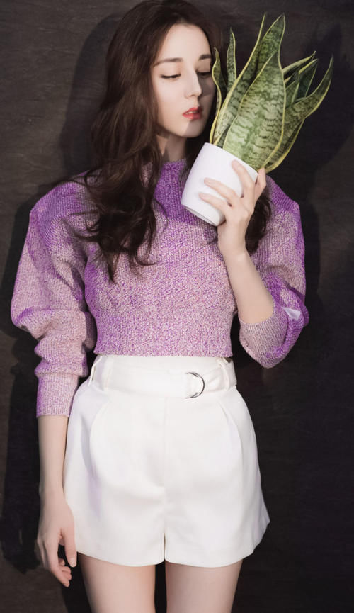 紫色圆领针织夹克简洁大方,突显身材,衬托出白色和半透明的肤色。泡泡袖的设计改变了肩部和颈部的线条,增加了线条的美感。将外套系在白色高腰短裤上,勾勒出纤细的腰身,展现出更高挑的身材比例,干练而温柔