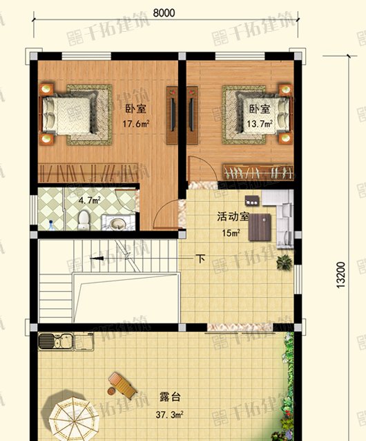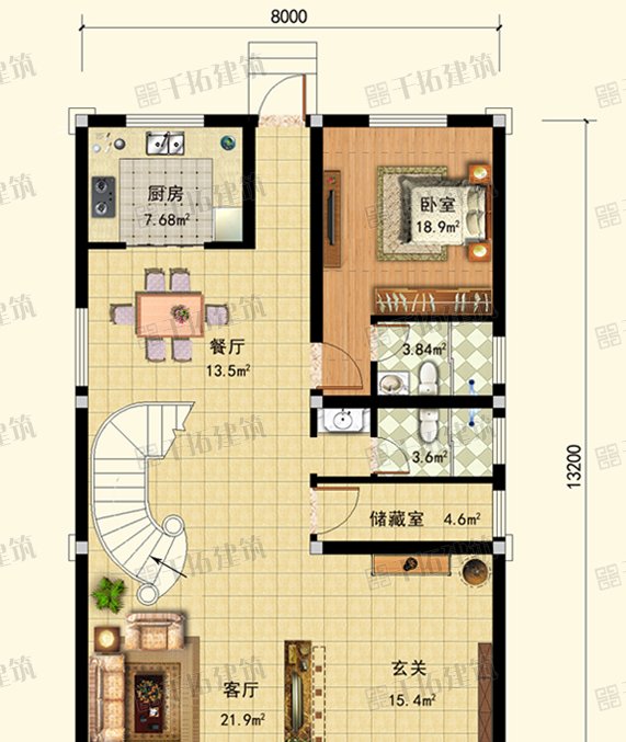 一层布置:房屋应穿过大门。进入房间的人的视觉缓冲将通过门廊进入房间的客厅。客厅的面积约为20平方米,与8米宽的房子相比不算小。客厅的一侧有一个旋转楼梯,可以让你进入二楼。