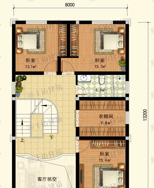 在二楼有三间卧室,客厅设计成空的。选择空的客厅区域可以根据自己的喜好改成小客厅主卧室有一个3平方米的小阳台,方便晾晒衣物。主卧室的北面还有一个衣帽间,方便存放衣物。