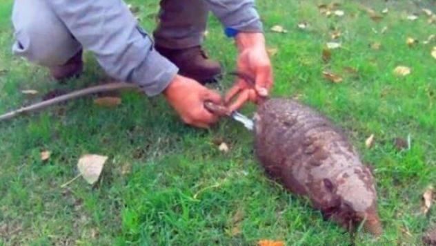 最后,这个人找到一根水管把它清洗干净,终于知道它是什么了。原来是一只装甲鼠