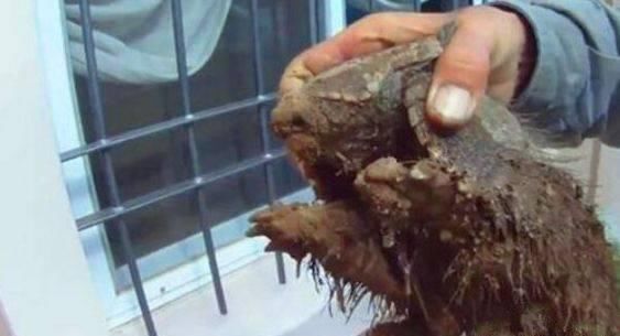 不放弃,他直接拿了一桶水往洞口倒,顺便继续用铲子戳不久,一个黑暗的生物从洞口爬了出来,这个人也没有给任何建议。不管是什么,他捡起来抓住了它。