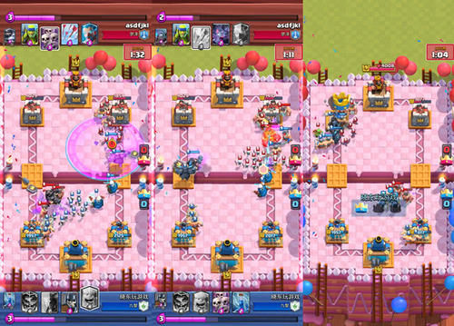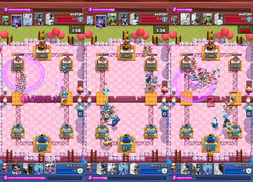 重复了几次,当圣水翻倍时,你可以考虑使用一辆大皮卡车,因为你的对手以前使用过超级骑手,所以你可以用她来瞄准超级骑手。然而,他的防守仍然不能放松。骷髅海和盾牌骷髅仍然被中心吸引,试图阻止对手的精英触及防御塔。