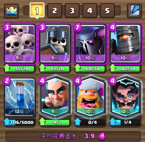 这套卡片的圣水平均价格是3.9英镑,这是一个很高的价格。此外,圣水回收是正常模式,所以在早期阶段尽量少用大型皮卡。里面没有建筑和空战卡。如果对手使用气球士兵,闪电法师应该被放在一边处理他们,避免被对手伏击。