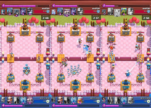 从第四滴圣水开始时,系统将刷掉第一批精英我们手里有骷髅海和盾牌骷髅。精英们过河后,我们将直接把盾牌骷髅放在中间,让他们防守第一波。