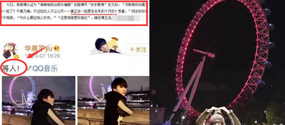 两人都是流行歌手,所以约会当然必须秘密进行2015年10月7日,国庆节宣布后,华晨雨在摩天轮下等人。不久,邓紫棋出现在摩天轮下,笑着,像个孩子一样快乐。爱的姿态让粉丝们久久不能释怀。