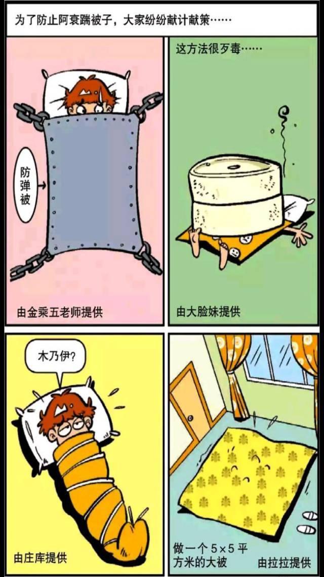 为了防止踢被子失败,每个人都提出了建议:防弹被子、木乃伊更可行;但是大姐大提供的方法有点恶毒,拉拉提供的方法会宠坏阿帅。< p>