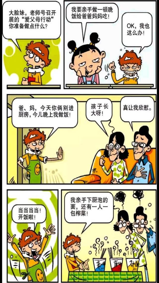 阿水今晚将为父母做饭,给父母带来欢乐的泪水。但是真正的食物是泡面和榨菜。我的父母不再快乐了。生病的母亲担心阿帅踢被子会着凉,所以她把被子的四个角都钉住了,认为这样很安全但是阿帅梦见自己把被子踢成了碎片,但他还是没能阻止!< p>