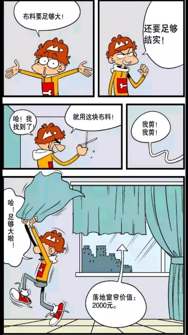 阿帅想找一块足够大、足够结实的布来做风筝。他把他家价值2000元的落地窗剪掉。我想他妈妈看到了,会打他的< p>