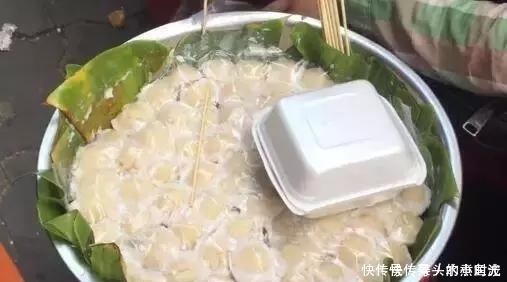 当顾客来购买这种小吃时,他们还会专门准备一个一次性食品盒,然后用竹签直接将食品放入盒中。一整箱只需要10元钱。事实上,对许多人来说,他们不知道名字,可以看到阿姨也把一些香蕉叶放在盘子里,然后准备好的白色小吃一层一层地放在盆里,看起来像一些糯米鱼,和当顾客前来购买时,他们会直接拿起竹签,一根接一根地拣出来,放在盒子里。