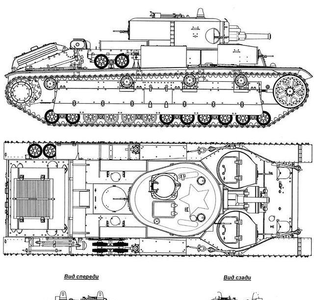 ■ T-28中型坦克的四线视图显示,前机枪塔和主炮塔中布置了一挺枪和四挺机枪。