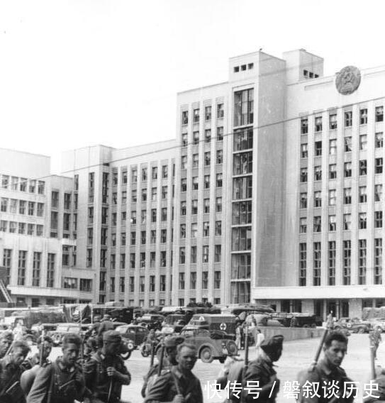 ■1941年6月在明斯克街头行进的德国军队也在市政大楼前停放了许多德国车辆