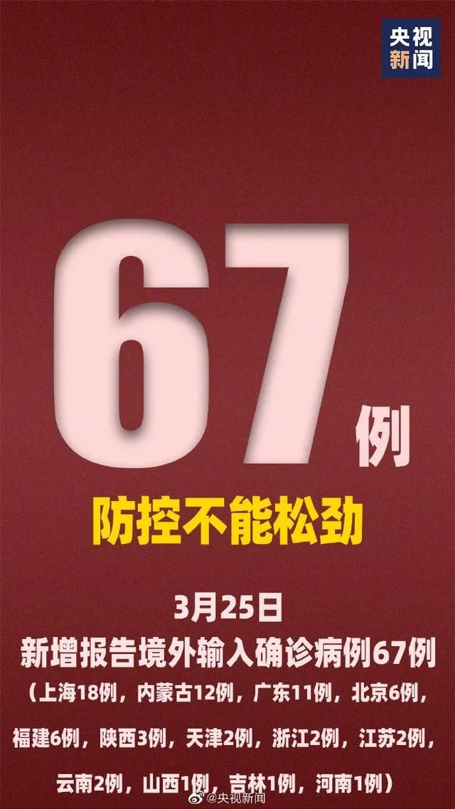 根据国家卫生和卫生委员会的最新报告,3月25日0时至24时,31个省(自治区、直辖市)和新疆生产建设兵团报告了67例新确诊病例,全部从国外输入