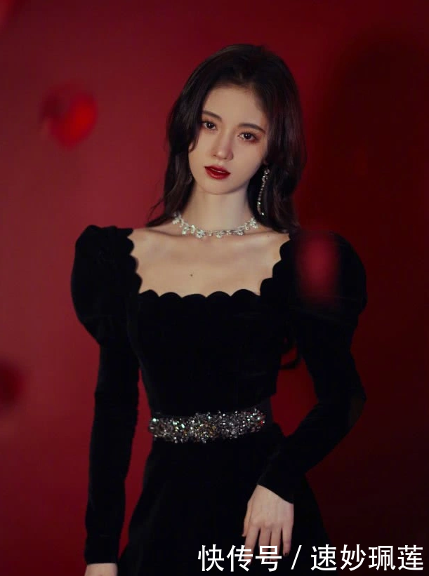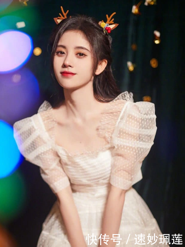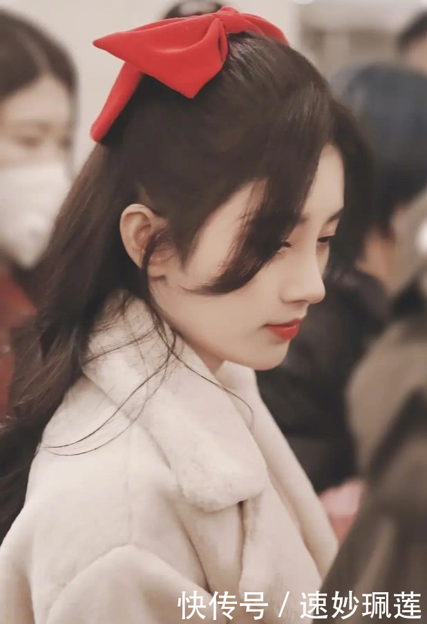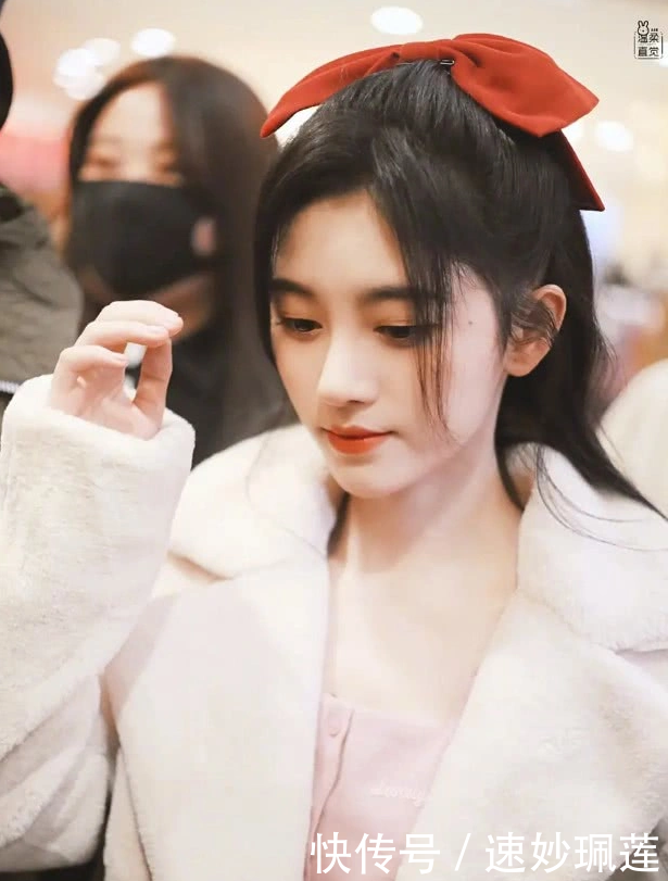 红色蝴蝶结马尾辫,额前的刘海成功地修饰了脸部,看起来非常迷人和精致简单的连衣裙凸显了女神的气质,方形衣领的粉色内饰成功地展示了它美丽的锁骨。