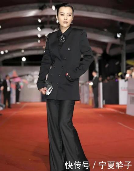 黑色西装在款式选择上很大气,一点正式的感觉都没有。该款夹克采用加长设计,能展现女性气质。然而,这个版本更适合苗条的女孩。小女孩们会通过将长夹克和裤子搭配起来,在视觉上缩短腿部的比例。然而,郝蕾穿上这个版本却没有这样的效果。下半身的宽裤腿充满下垂感,对腿部类型的修饰有很好的作用。