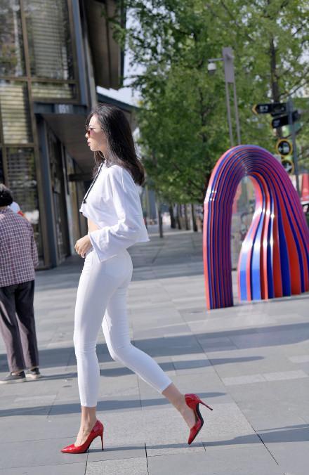 只看了看穿着白色上衣和白色紧身衣的小妹妹,还有那双红色高跟鞋,它们看起来很有都市气息,完美地展现了美丽女人的完美身材,使她的身材更高更出众。小妹妹耳朵上的大耳环给人一种很酷的感觉,就像传说中成熟性感的白领妹妹。