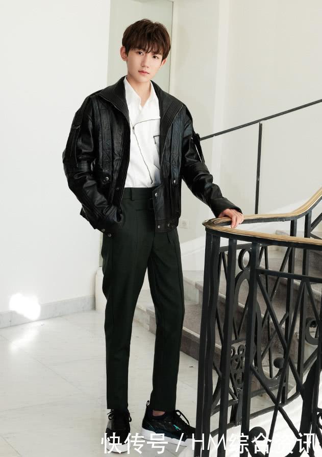 王源穿着白色衬衫和黑色皮夹克。很酷。它简单而优雅,配有一条黑色裤子。踩一双黑色运动鞋让他更有日常品味。