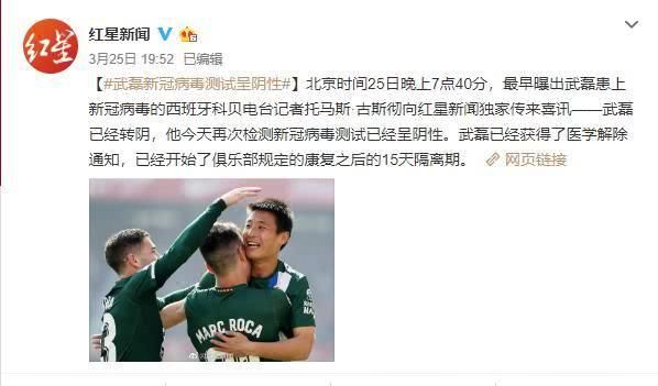 北京时间3月25日晚19时40分,国内媒体《红星新闻》证实,武磊最新的冠状病毒检测结果为阴性,并已被告知医疗放行。