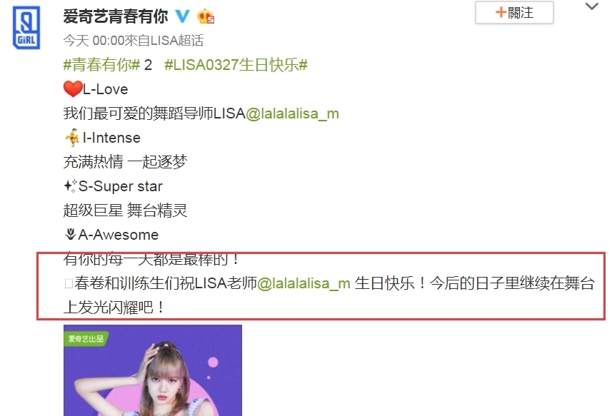 是丽莎昨天3月27日的生日,所以“青春与你2”节目组也及时发布了一份文件来庆祝丽莎的生日,官方在最后一句话中说:“在未来的日子里继续在舞台上闪耀!”这句话也清楚地表达了丽莎不会退出这个项目。在这个舞台上,丽莎将继续和每个人一起闪耀。可以说,官方宣布后,大家都松了口气。