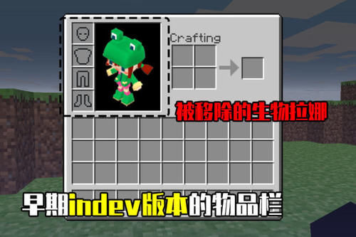 在早期版本的indev中,玩家按下e键打开项目栏。左上角展示的不是史蒂夫,而是一个名叫“拉娜”的古代生物。这个生物在infdev版本中被删除,设计它的艺术家也退出了mojang。