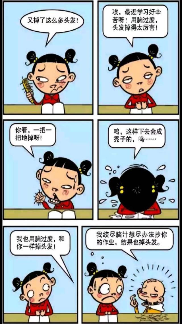 大脸妹妹正在学习过度使用大脑,头发一根一根脱落;然而,阿帅正在绞尽脑汁抄作业。他失去了所有的头发,变成了秃头。< p>
