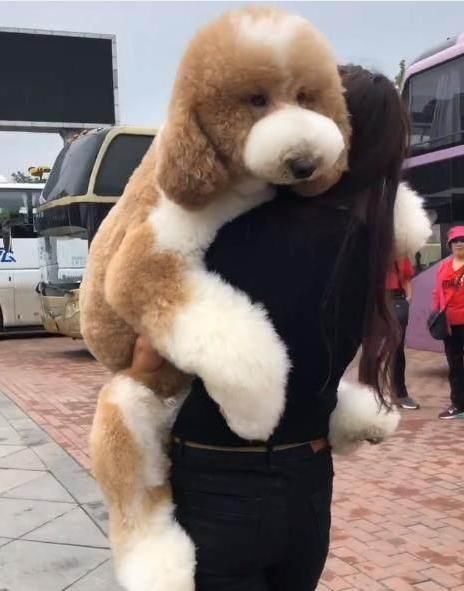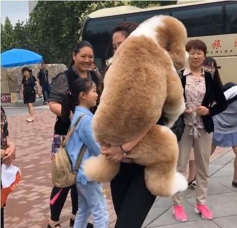 美女抱了一会儿,似乎累了,就直接把娃娃放在地上我没想到这个洋娃娃落地时会走上来,还会转过身来,美丽的女人摇着尾巴。每个人都被这一幕震惊了,然后立刻大笑起来。这真是一只活着的大泰迪熊。它根本不是木偶。难怪它看起来如此逼真