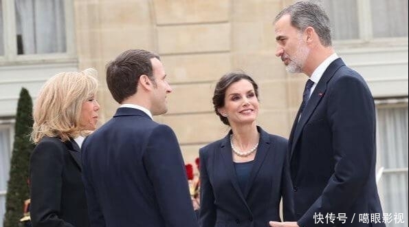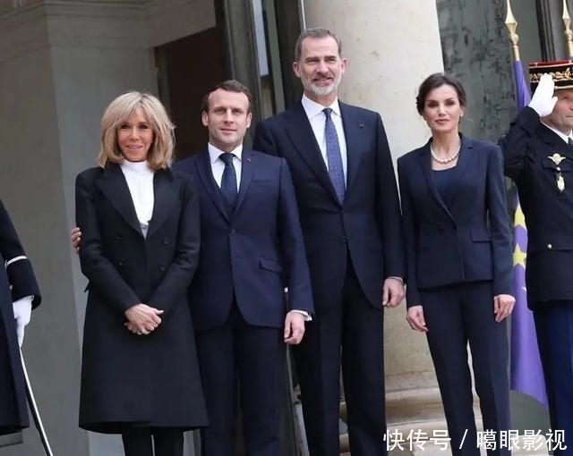 同一天,莱蒂奇穿了一套修身的高跟鞋套装。她又高又能干,头发卷得很漂亮。戴着这条华丽的大珍珠项链,皇室的高贵感觉完美地展现在她身上。与法国女士相比,她穿得非常简单。黑色长外套的领子显示出白色的内部,她的脚穿着黑色的靴子。长袖高领款式把她裹得很紧,看不到任何珠宝。