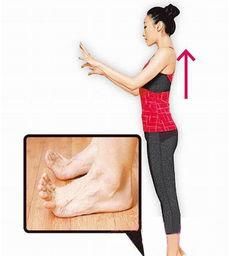 吸气,脚跟抬起,脊柱向上伸展,呼气。收紧腹部核心肌肉群
