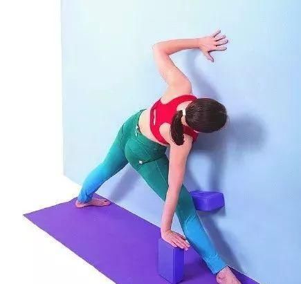右手放在右小腿外侧的瑜伽砖上,左肘弯曲在墙面