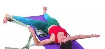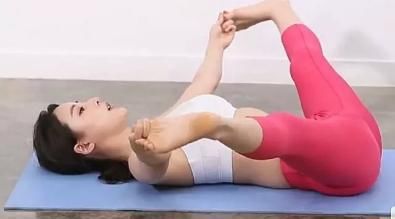 呼气时,将右腿拉向上身,自然放松左腿,放在两肩背部的垫子