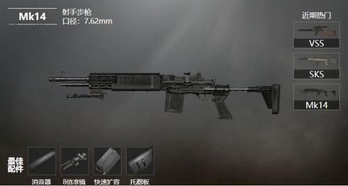 的优点是威力巨大,两枪可以消灭三级头,单枪有很高的杀伤力,由于前面有支架,你还可以躺下,稍微减少射击的后坐力,配件可以选择全息和八倍镜不过,小翔并不建议孟新他们一到这里就开始,因为这真的很难控制,而且MK14子弹也会让你感到头痛。